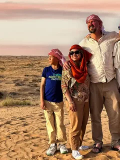 /A family poses for a photo in a historic belltower at the Hacienda Cusin hotel